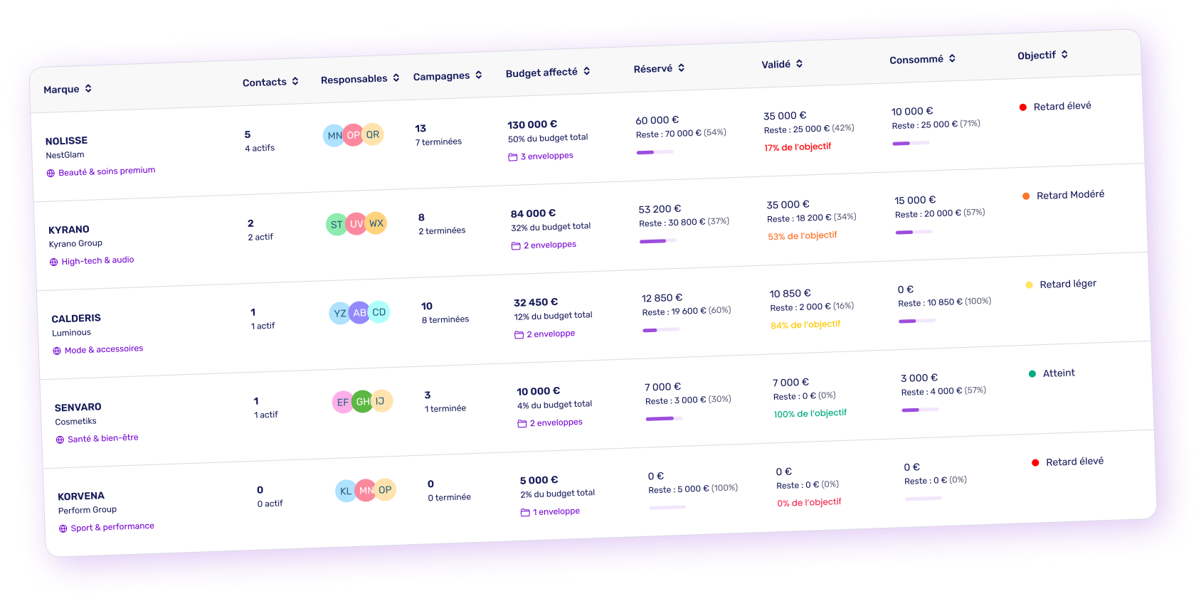 Pour donner davantage de visibilité aux équipes sur l’exécution budgétaire, Duyo introduit une nouvelle vue liste des marques enrichie d’indicateurs, ainsi qu’un système complet pour paramétrer des objectifs mensuels et qualifier automatiquement les retards. L’objectif : mieux prioriser les actions (relances, arbitrages) et suivre la performance budgétaire avec un référentiel clair et partagé.