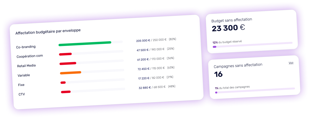 Pour accompagner la création des enveloppes budgétaires (introduite précédemment), votre Dashboard s’enrichit de nouveaux widgets dédiés au suivi de l’affectation des budgets. Objectif : vous permettre d’avoir une vision claire du niveau d'affectation et de consommation de vos enveloppes budgétaires.